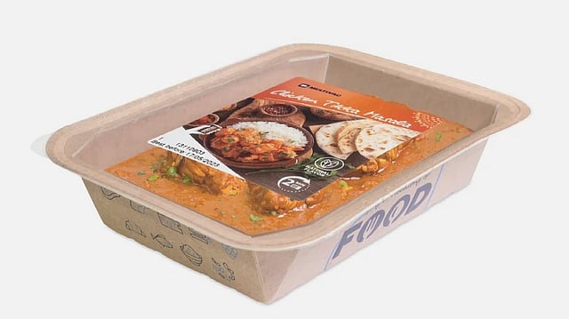 TX 620 is distinguished by its intelligent machine and line control, as well as the highest standards of hygiene. The filled trays are stacked automatically in containers by a Cobot (MULTIVAC Combined Automations). The line will be packing ready meals under modified atmosphere in a sustainable cardboard tray, which is sealed very reliably with a thin recyclable film.